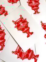 Limited edition signed and numbered silk screen print of a classical urn, hand-printed in burnt orange. This illustration highlights ornamental flourishes and sculptural elements.